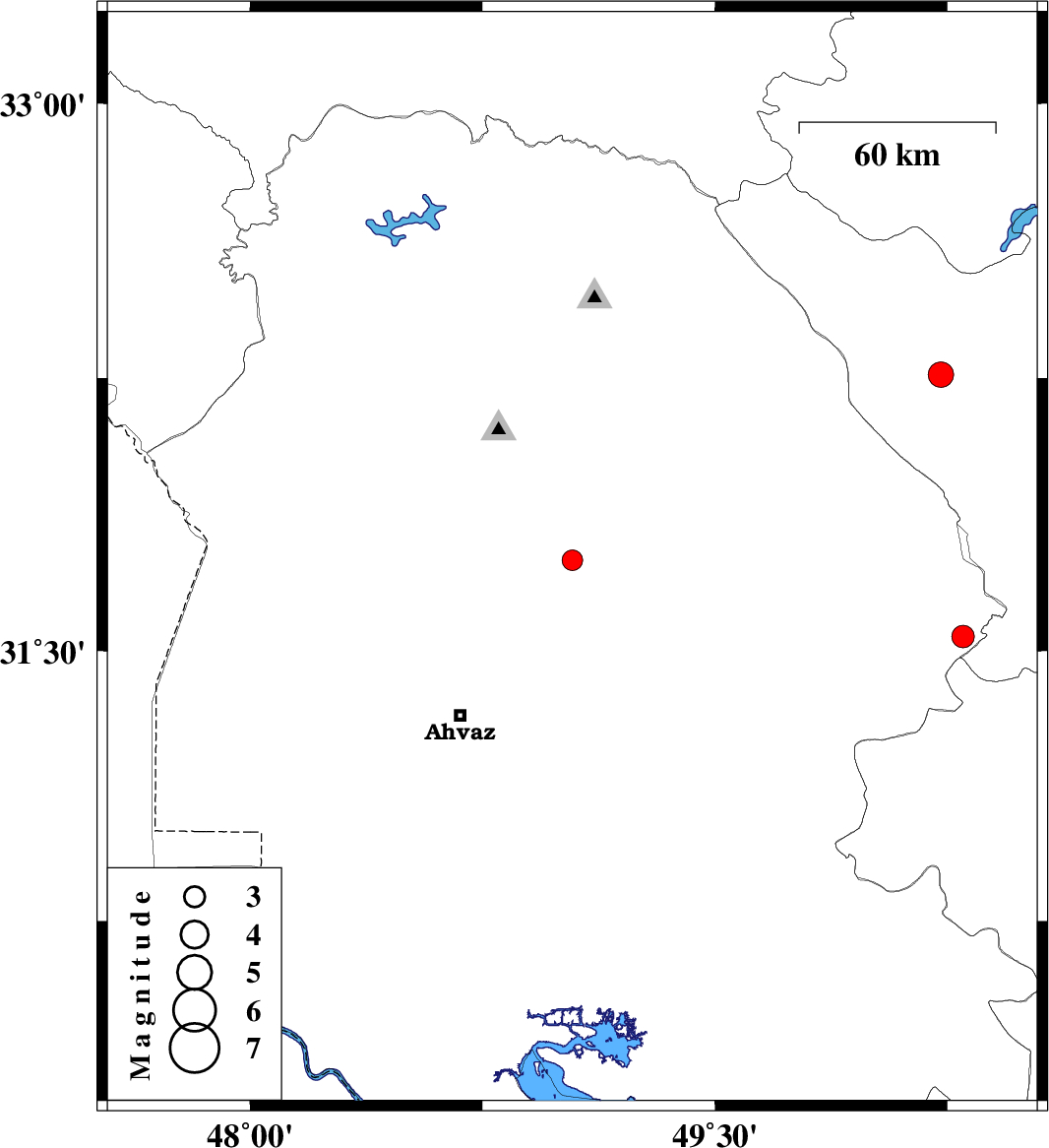 | 2008/08/15 | 02:11:58.6 | 06:41:58.6 | 31.54 | 50.3 | 14 | ML:3.2 | 37 km East of Bagh Malek, Khoozestan Province |