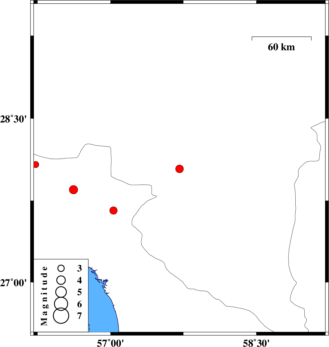 | 2008/08/11 | 20:09:01.0 | 00:39:01.0 | 27.85 | 56.62 | 16 | ML:4 | 77 km North-West of Dehbarez, Hormozgan Province | ||