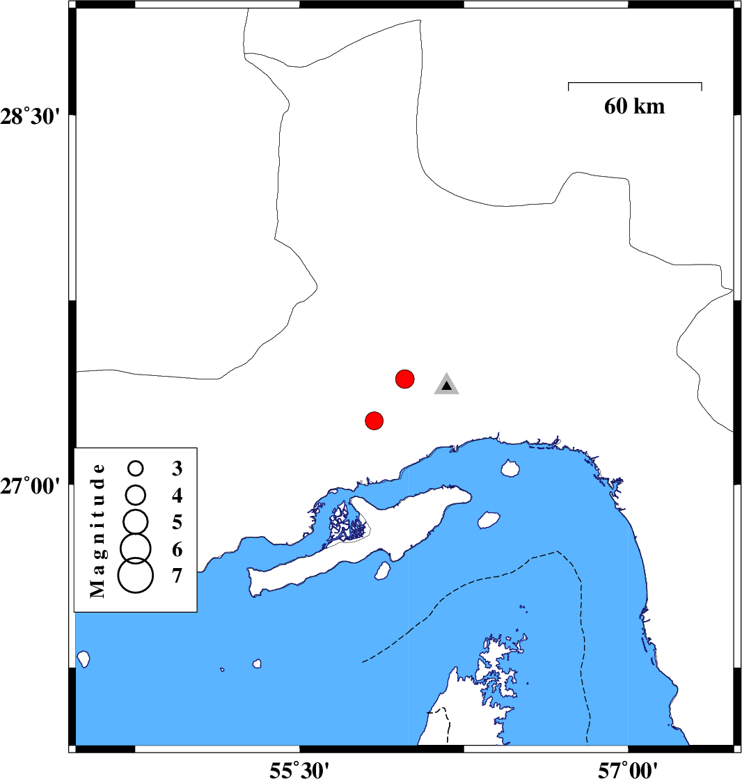 | 2008/08/24 | 01:46:23.2 | 06:16:23.2 | 27.26 | 55.84 | 1 | ML:3.6 | 44 km West of Bandar-e abbas, Hormozgan Province | ||