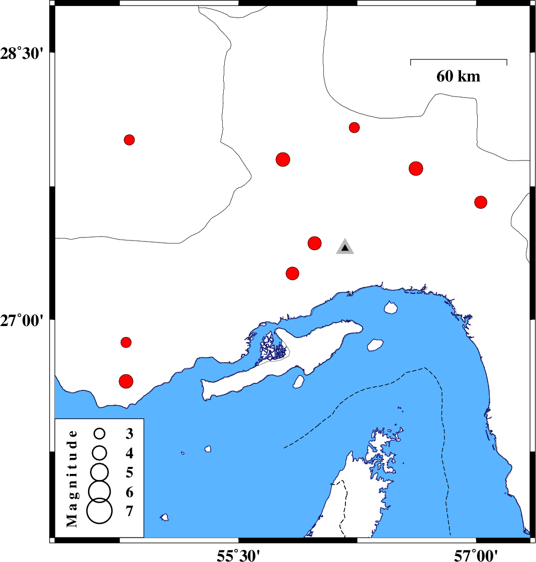 | 2008/08/04 | 09:08:45.7 | 13:38:45.7 | 26.65 | 54.79 | 15 | ML:3.9 | 14 km North of Bandar-e lengeh, Hormozgan Province | ||