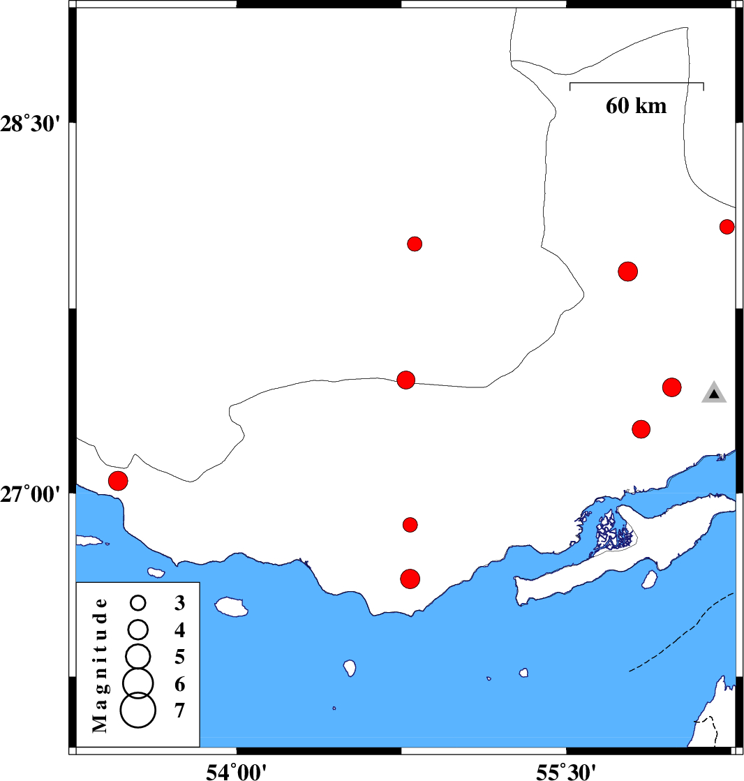 | 2008/08/04 | 09:08:45.7 | 13:38:45.7 | 26.65 | 54.79 | 15 | ML:3.9 | 14 km North of Bandar-e lengeh, Hormozgan Province | ||
