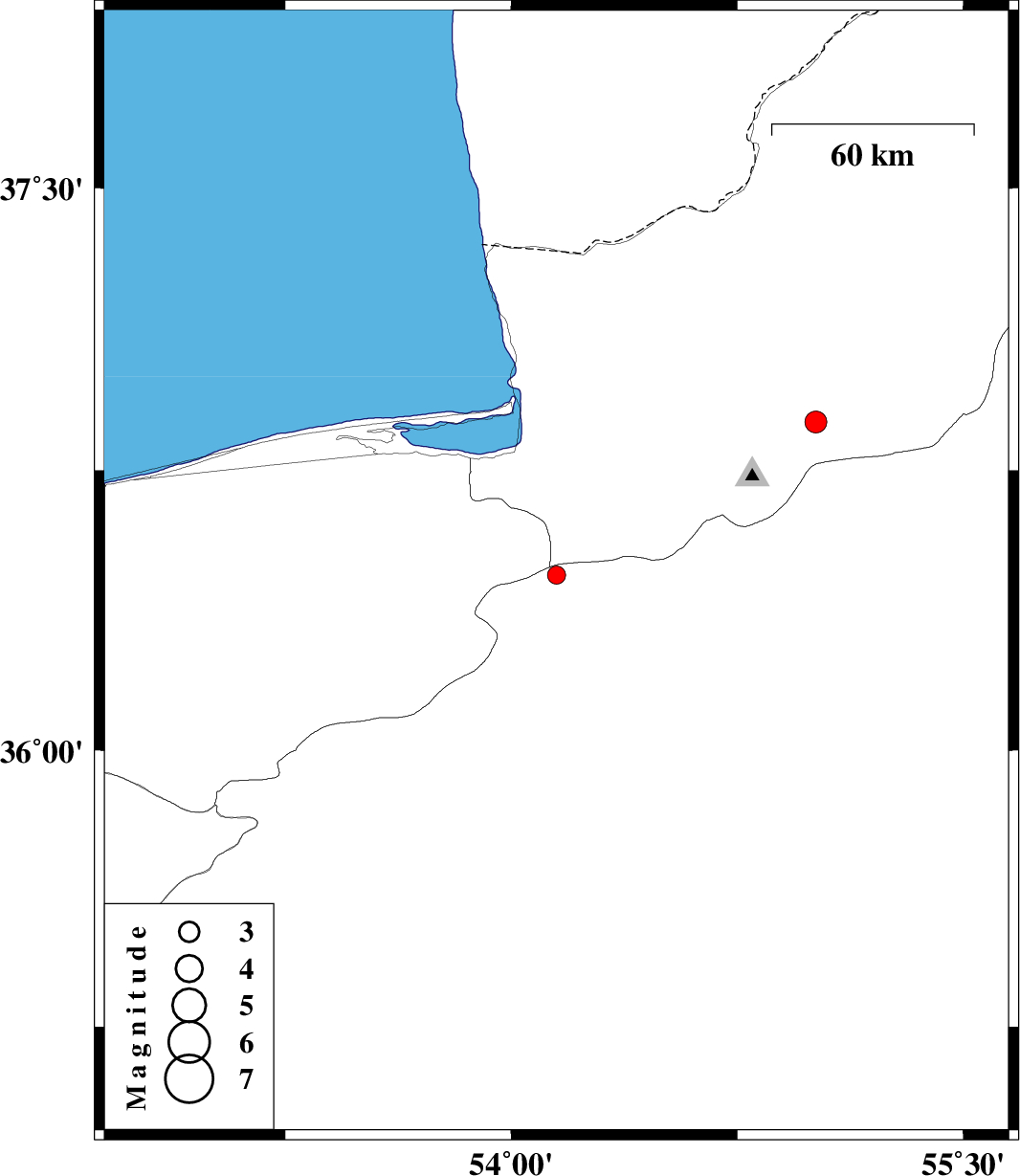 | 2008/08/21 | 23:42:28.2 | 04:12:28.2 | 36.88 | 55.01 | 14 | ML:3.2 | 12 km East of Ali Abad, Golestan Province |