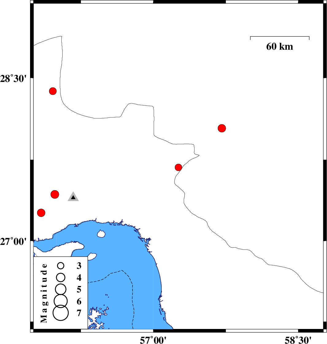 | 2008/08/20 | 15:20:35.2 | 19:50:35.2 | 28.04 | 57.71 | 15 | ML:3.6 | 10 km Kahnuj, Kerman Province |