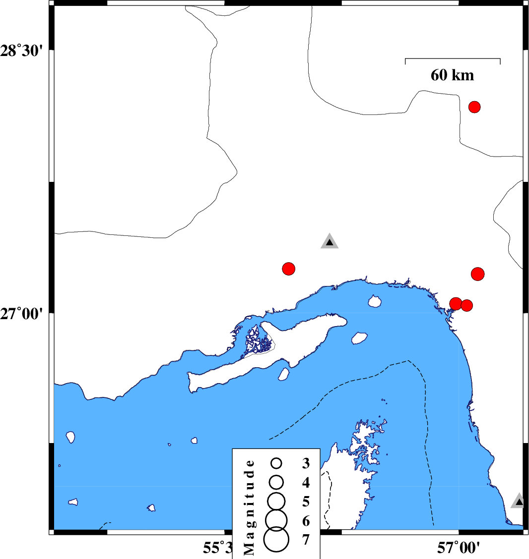 | 2008/08/27 | 20:20:18.8 | 00:50:18.8 | 27.25 | 55.91 | 5 | ML:3.4 | 37 km West of Bandar-e abbas, Hormozgan Province | ||