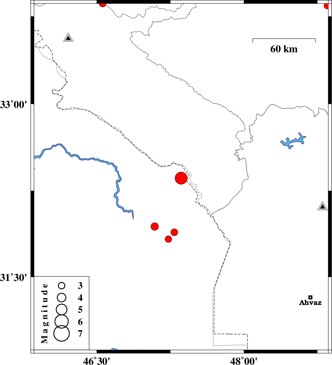 | 2008/08/27 | 21:52:39.9 | 02:22:39.9 | 32.36 | 47.36 | 33 | ML:5.6 | 38 km South of Dehloran, Ilam Province | ||