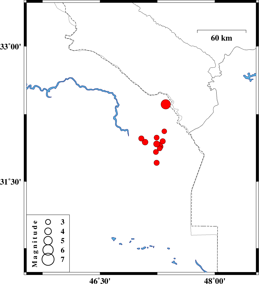 2008/08/27 21:52:39.9 02:22:39.9 32.3647.3633 ML:5.6 38 km South of Dehloran, Ilam Province