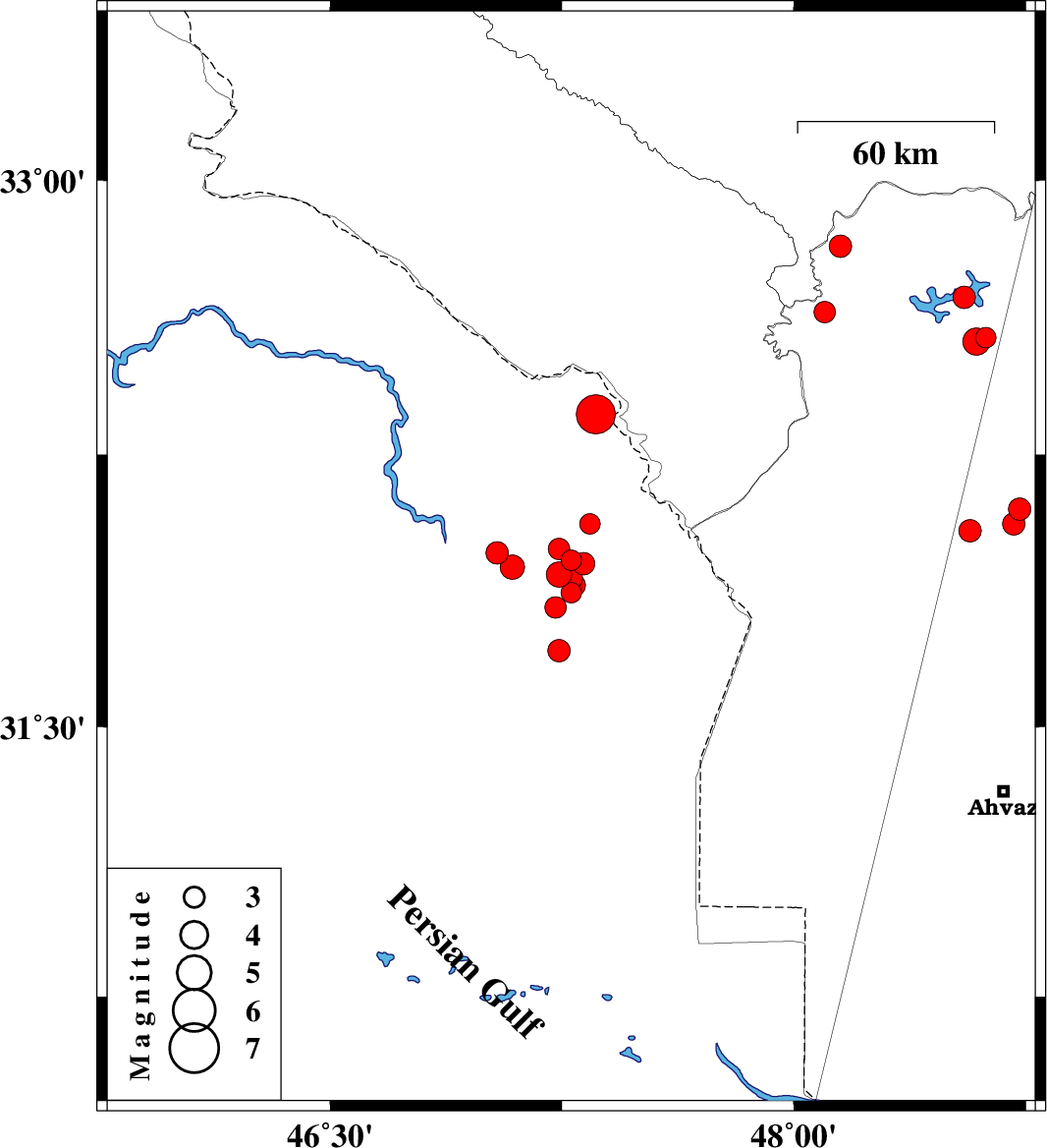 2008/08/28 | 09:13:11.9 | 13:43:11.9 | 31.92 | 47.24 | 37 | ML:3.6 | 86 km South of Dehloran, Ilam Province | ||