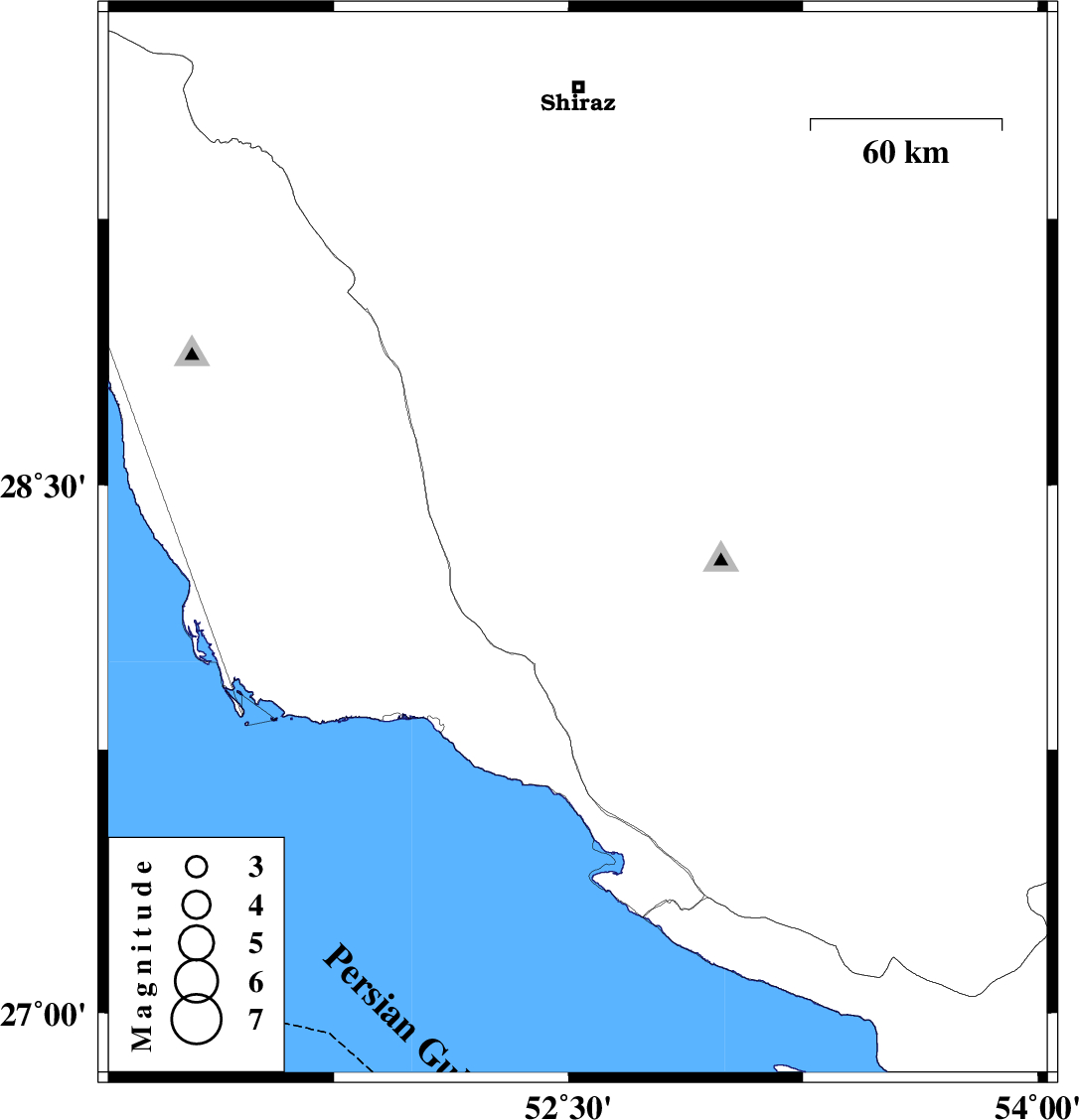 | 2008/09/01 | 08:08:54.1 | 12:38:54.1 | 28.33 | 52.53 | 3 | ML:3.4 | 51 km South-West of Qir va Karzin, Fars Province |