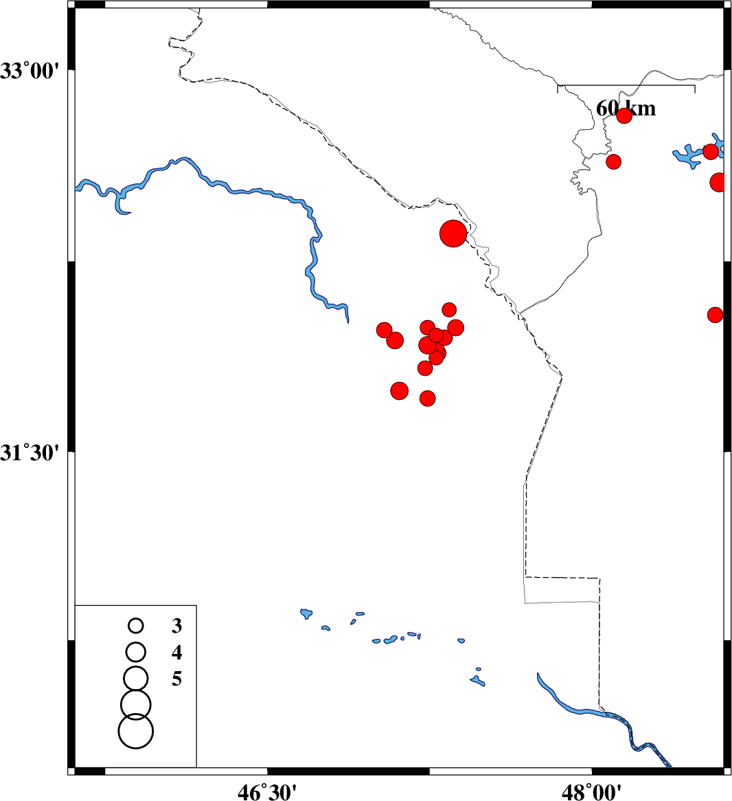 2008/08/27 | 23:16:17.9 | 03:46:17.9 | 31.83 | 47.23 | 37 | ML:3.1 | 95 km North-West of Susangerd, Khoozestan Province | ||
