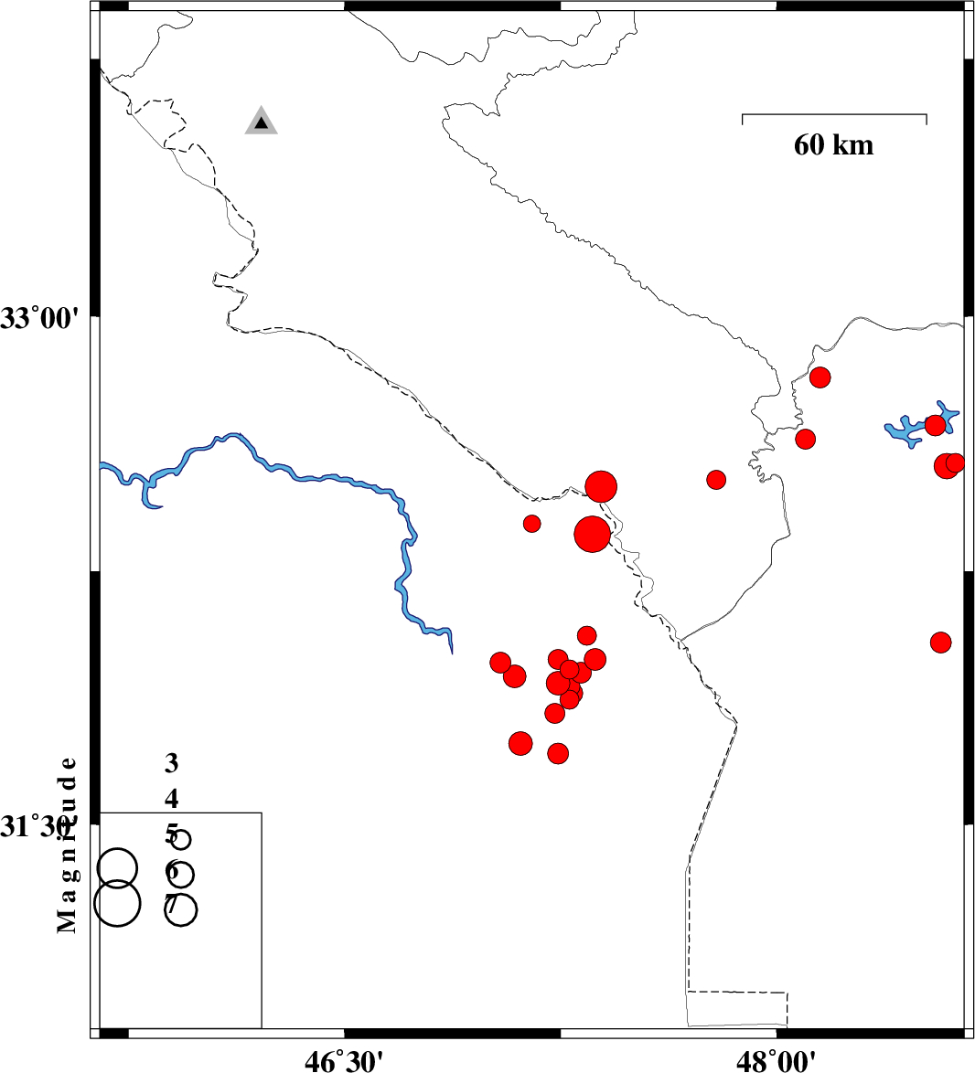 2008/08/28 | 02:43:57.5 | 07:13:57.5 | 31.87 | 47.28 | 37 | ML:3 | 91 km South of Dehloran, Ilam Province | ||