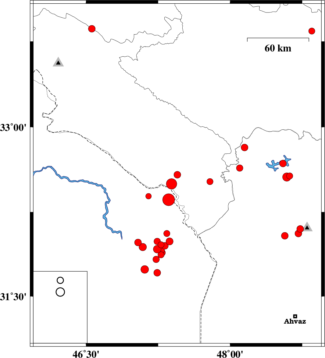 2008/09/02 | 22:32:17.7 | 03:02:17.7 | 31.99 | 47.37 | 36 | ML:3.4 | 78 km South-East of Dehloran, Ilam Province | ||