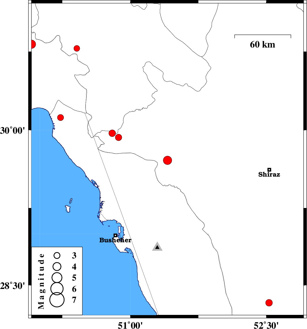 | 2008/09/05 | 03:11:42.5 | 07:41:42.5 | 29.71 | 51.41 | 15 | ML:4.2 | 25 km West of Kazerun, Fars Province | ||