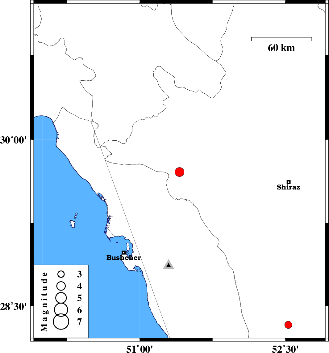 | 2008/09/05 | 03:11:42.5 | 07:41:42.5 | 29.71 | 51.41 | 15 | ML:4.2 | 25 km West of Kazerun, Fars Province | ||