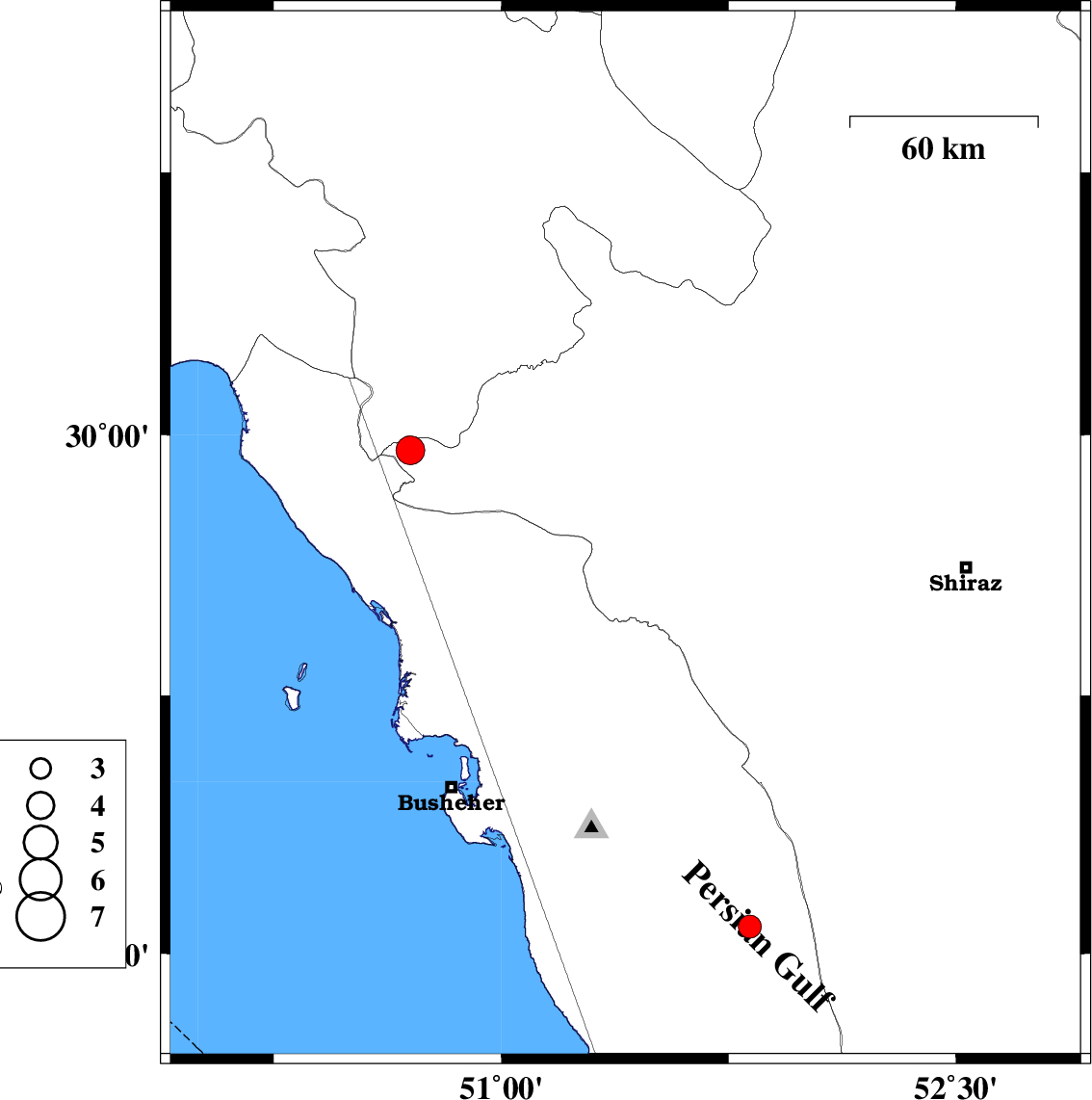 2008/09/05 | 03:11:42.5 | 07:41:42.5 | 29.71 | 51.41 | 15 | ML:4.2 | 25 km West of Kazerun, Fars Province | ||