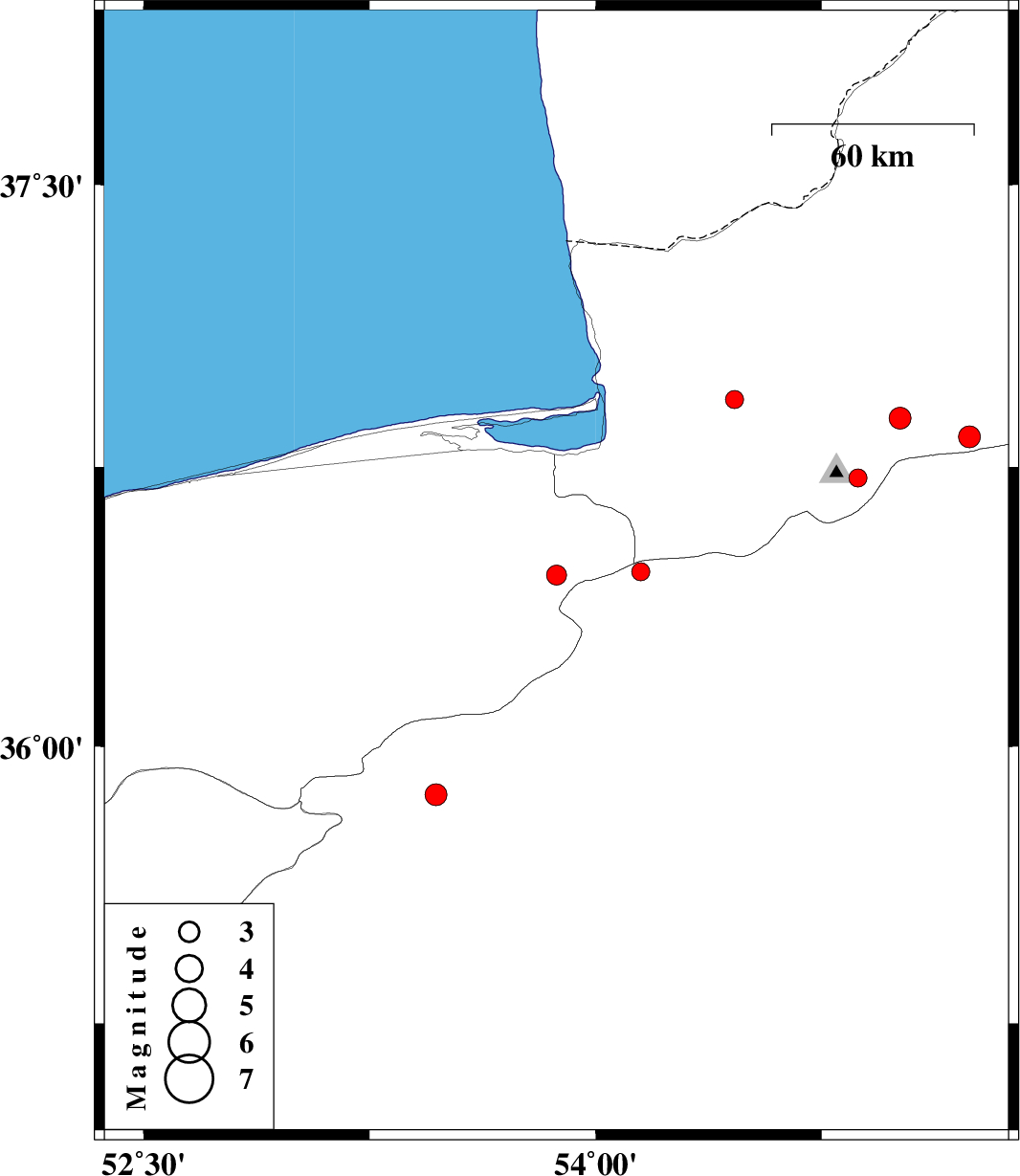 | 2008/08/10 | 00:29:49.6 | 04:59:49.6 | 36.83 | 55.24 | 15 | ML:3.3 | 21 km South of Ramian, Golestan Province |