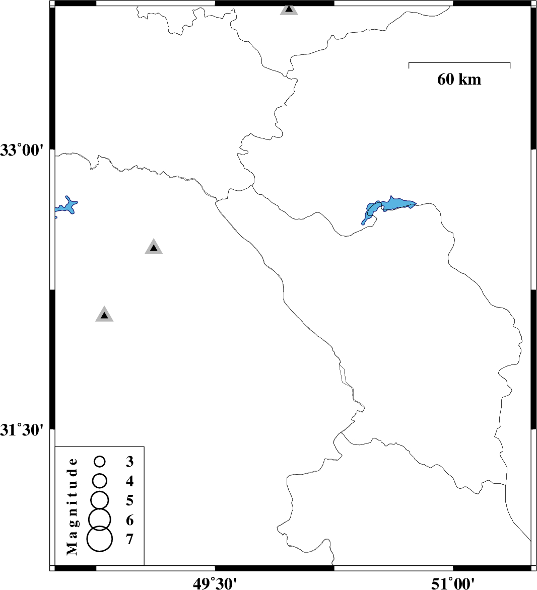 2008/09/09 | 09:29:12.4 | 13:59:12.4 | 32.26 | 49.99 | 14 | ML:2.6 | 26 km South-West of Chelgard, Chaharmahal Bakhtiari Province |