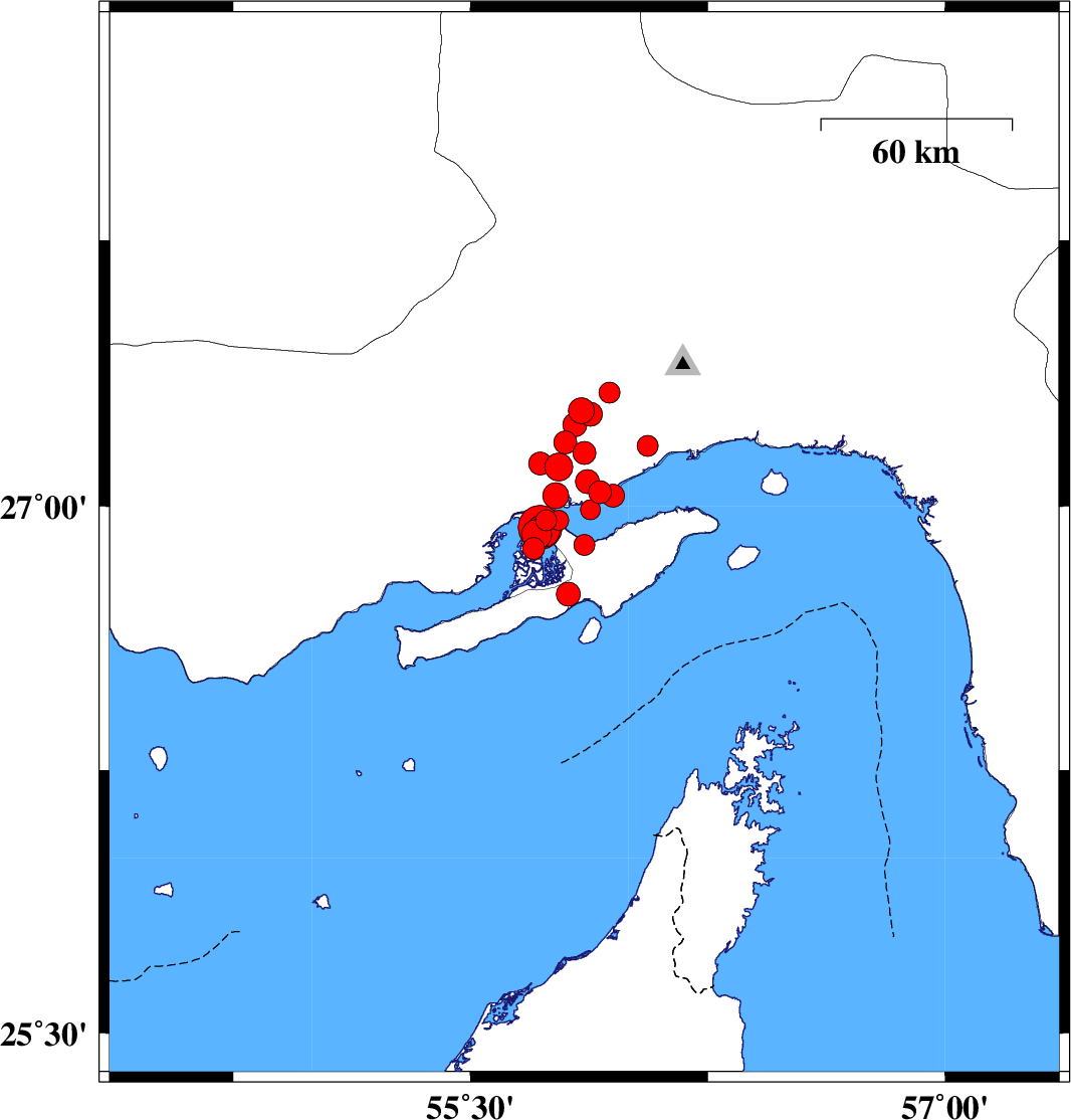 2008/09/10 15:57:57.6 20:27:57.6 26.7555.8110 ML:3.4 Persian Gulf, 50 km South-West of Qeshm