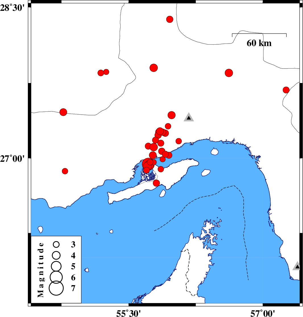 2008/09/10 19:03:15.5 23:33:15.5 27.0455.913 ML:3.3 36 km West of Qeshm, Hormozgan Province