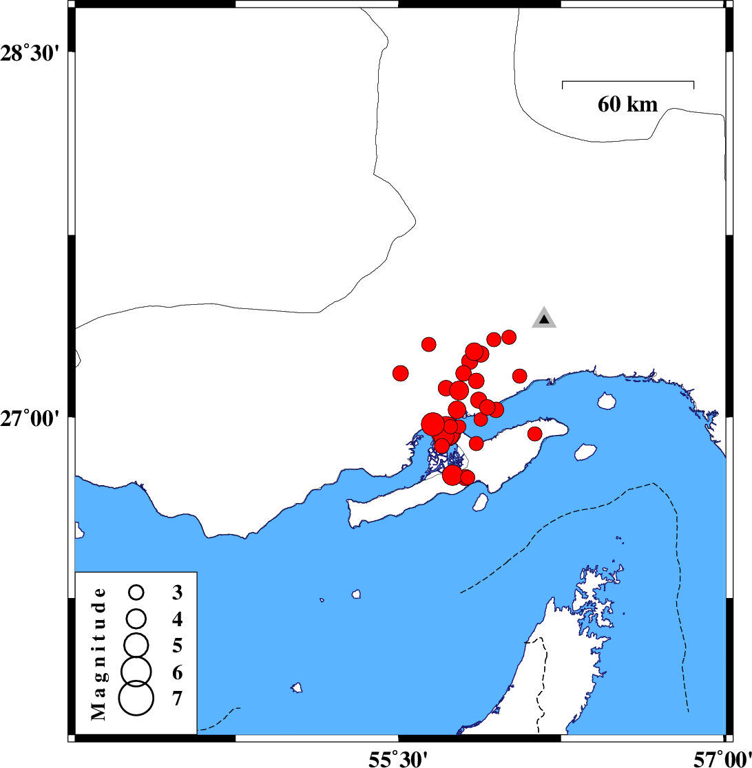 2008/09/10 19:03:15.5 23:33:15.5 27.0455.913 ML:3.3 36 km West of Qeshm, Hormozgan Province