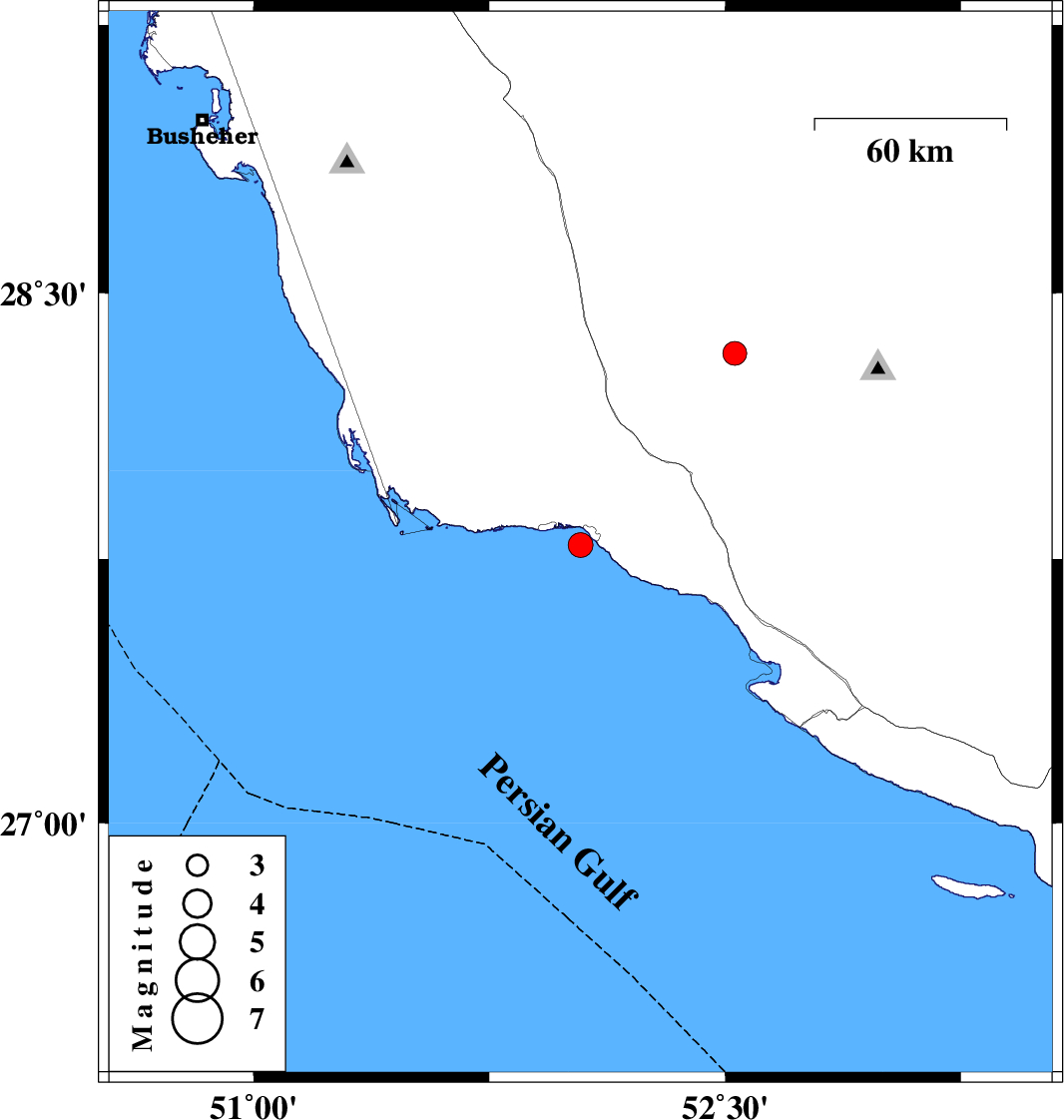 | 2008/09/13 | 01:04:25.3 | 05:34:25.3 | 27.79 | 52.04 | 15 | ML:3.5 | Persian Gulf, 4 km Bandar-e kangan | ||