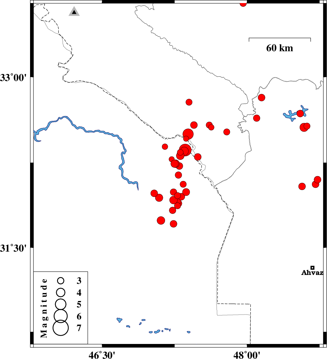 2008/09/03 | 22:43:15.4 | 03:13:15.4 | 32.5 | 47.39 | 14 | ML:4.9 | 24 km South-East of Dehloran, Ilam Province | ||
