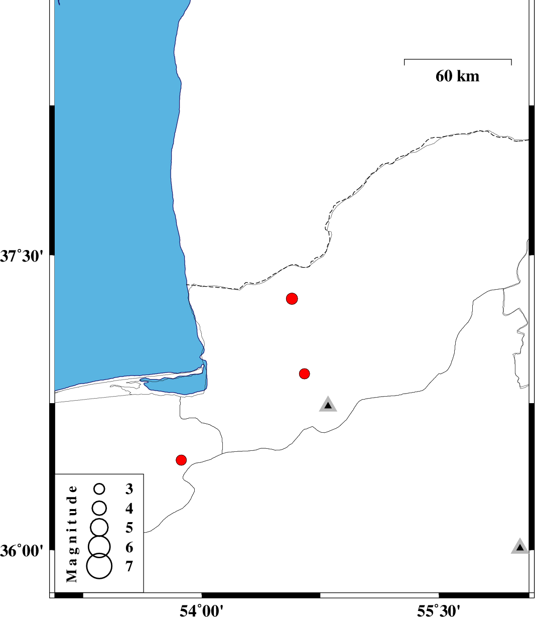 | 2008/09/14 | 08:00:08.4 | 12:30:08.4 | 37.28 | 54.57 | 17 | ML:3.2 | 31 km North-East of Aq Qaleh, Golestan Province | ||