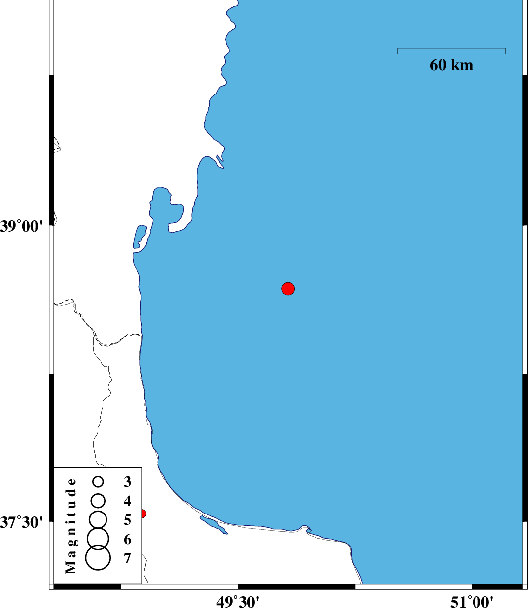 | 2008/09/14 | 23:32:34.3 | 04:02:34.3 | 38.68 | 49.82 | 14 | ML:3.7 | Caspian Sea, 88 km North-East of Astara | ||