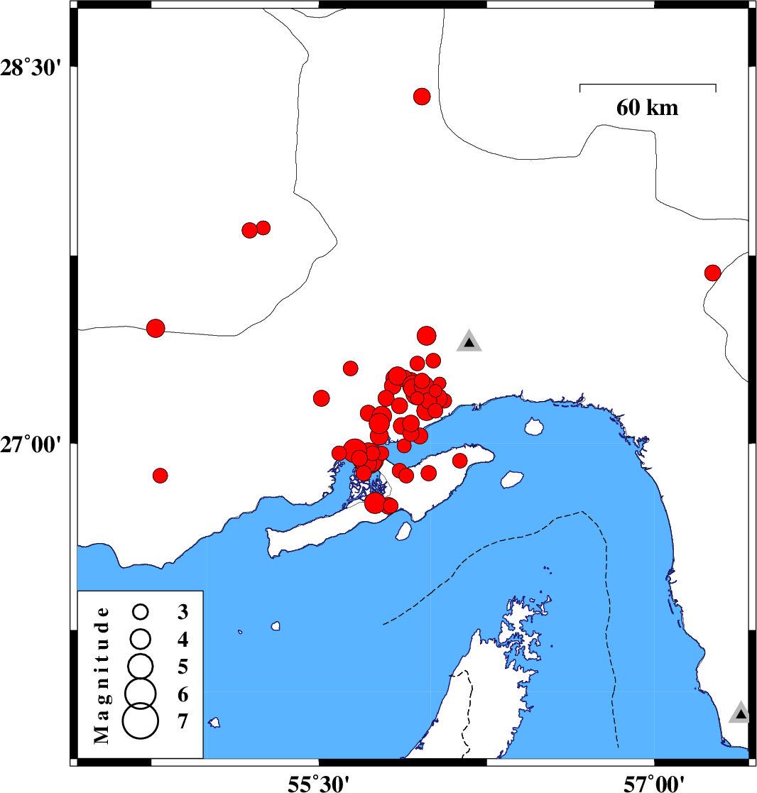 2008/09/10 19:03:15.5 23:33:15.5 27.0455.913 ML:3.3 36 km West of Qeshm, Hormozgan Province