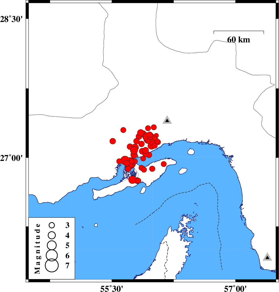 2008/09/10 19:03:15.5 23:33:15.5 27.0455.913 ML:3.3 36 km West of Qeshm, Hormozgan Province