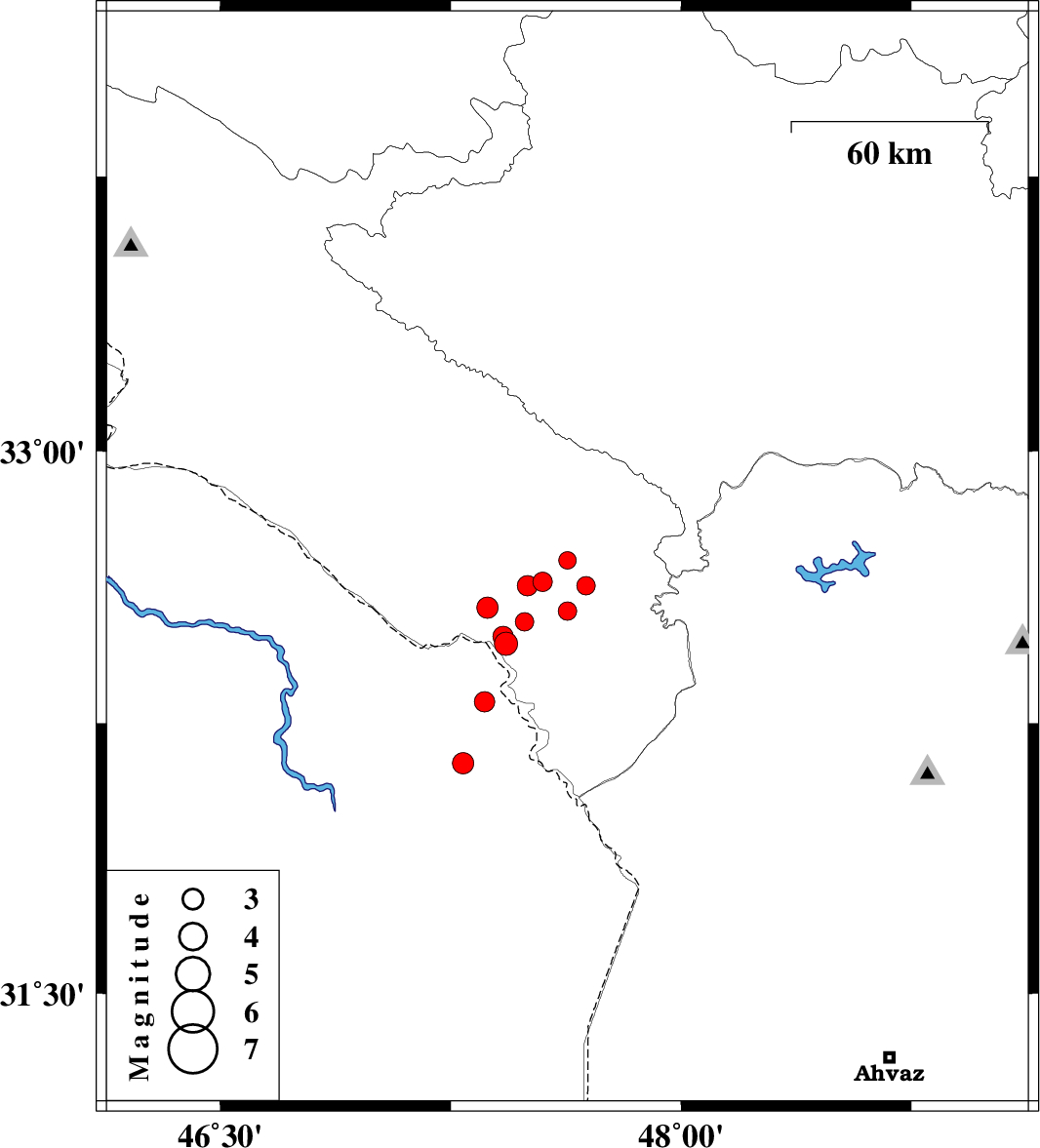 2008/09/13 02:00:58.5 06:30:58.5 32.5647.6314 ML:2.7 37 km South-East of Dehloran, Ilam Province