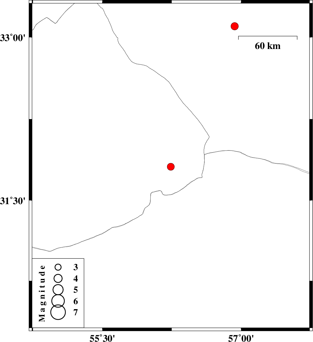 | 2008/08/24 | 14:52:47.5 | 19:22:47.5 | 33.1 | 56.93 | 14 | ML:3.7 | 56 km South of Tabas, Yazd Province |
