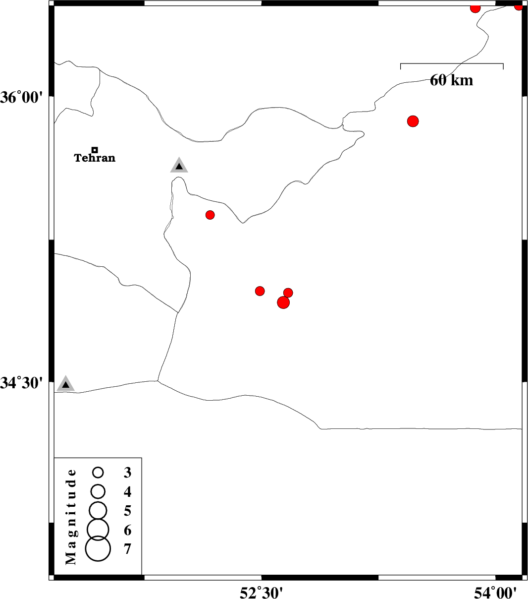 | 2008/09/15 | 22:27:01.2 | 02:57:01.2 | 34.92 | 52.64 | 15 | ML:3.5 | 42 km South-East of Garmsar, Semnan Province | ||