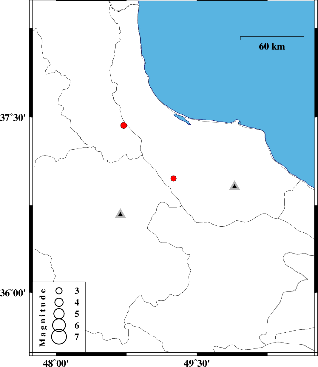 | 2008/09/25 | 23:28:15.5 | 02:58:15.5 | 36.98 | 49.25 | 14 | ML:2.7 | 23 km North-West of Rudbar, Gilan Province | ||