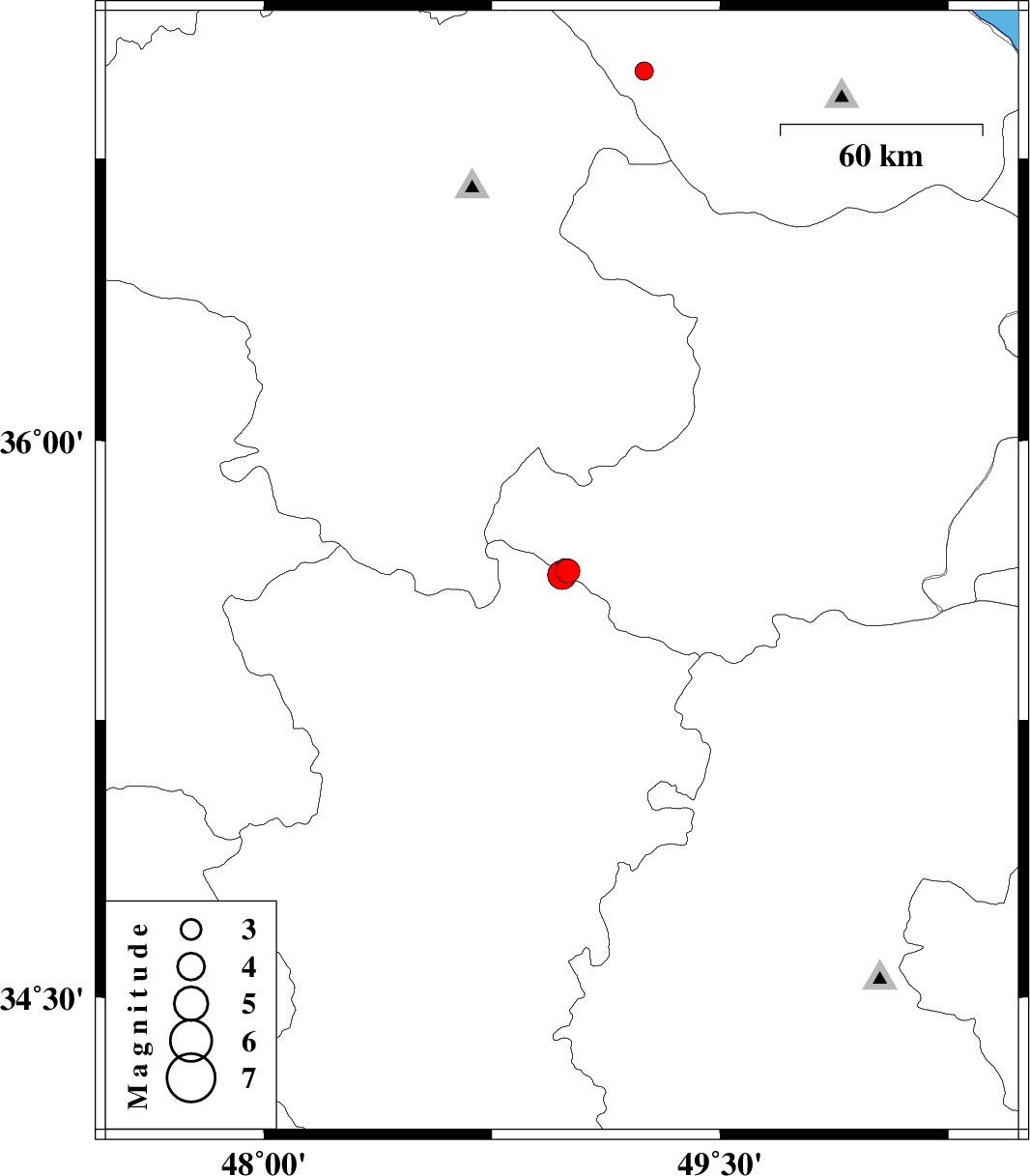 2008/09/26 | 11:00:05.9 | 14:30:05.9 | 35.64 | 48.98 | 15 | ML:4.3 | 28 km North of Razan, Hamedan Province | ||