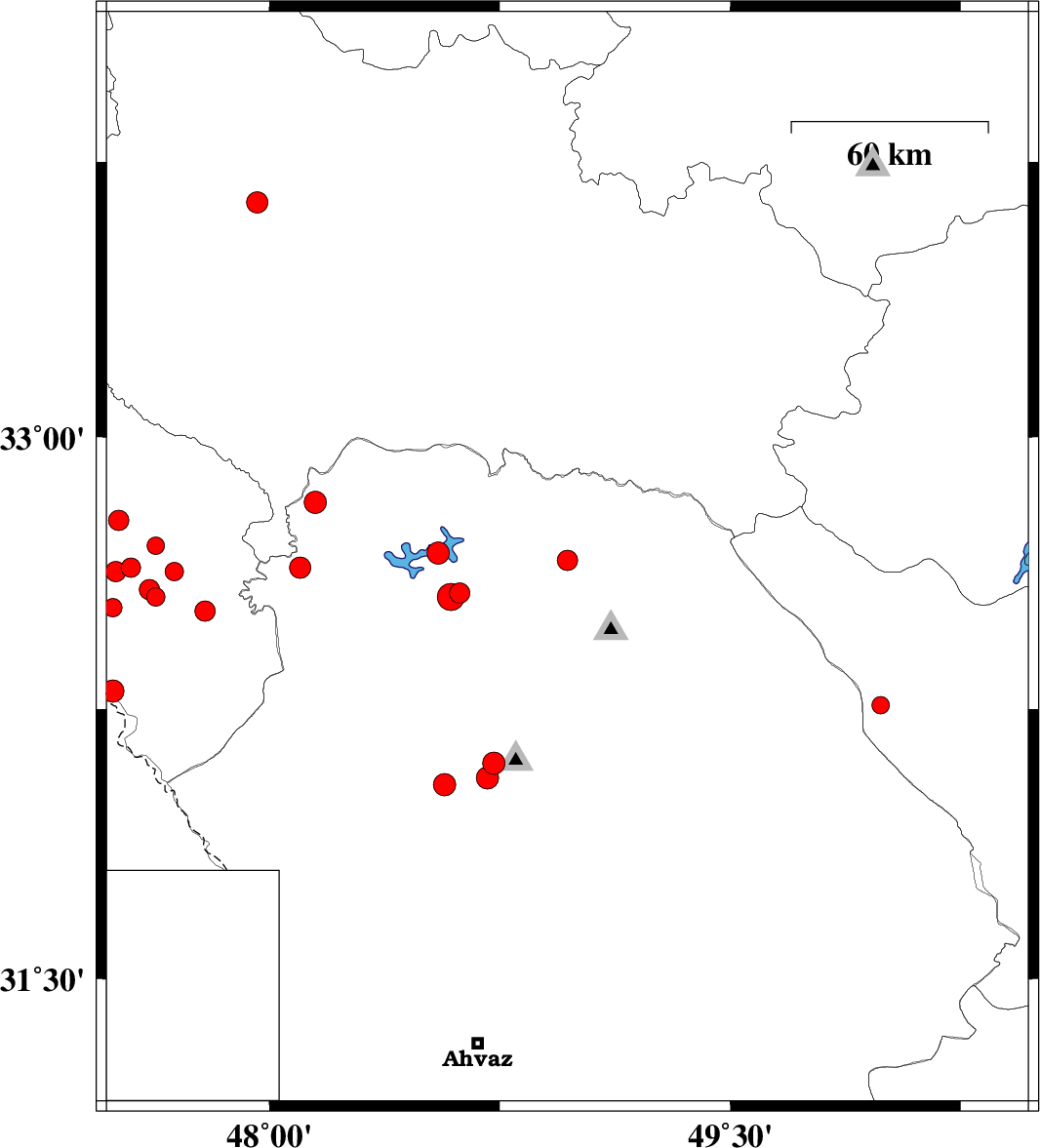 2008/08/30 | 15:24:27.1 | 19:54:27.1 | 32.82 | 48.15 | 28 | ML:3.3 | 44 km North-West of Andimeshk, Khoozestan Province | ||