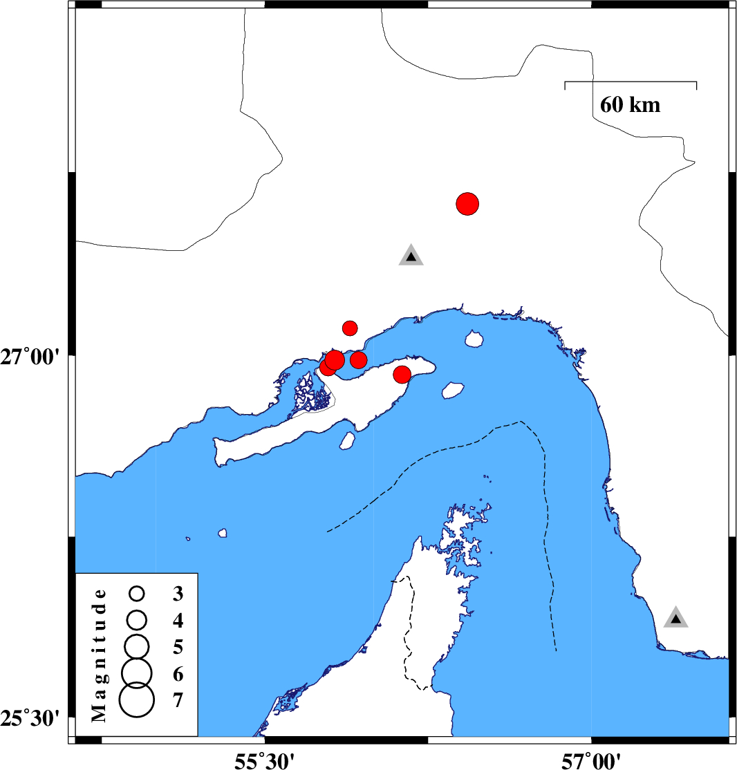 | 2008/09/26 | 03:36:32.3 | 07:06:32.3 | 26.98 | 55.82 | 6 | ML:4.1 | Persian Gulf, 44 km West of Qeshm | ||