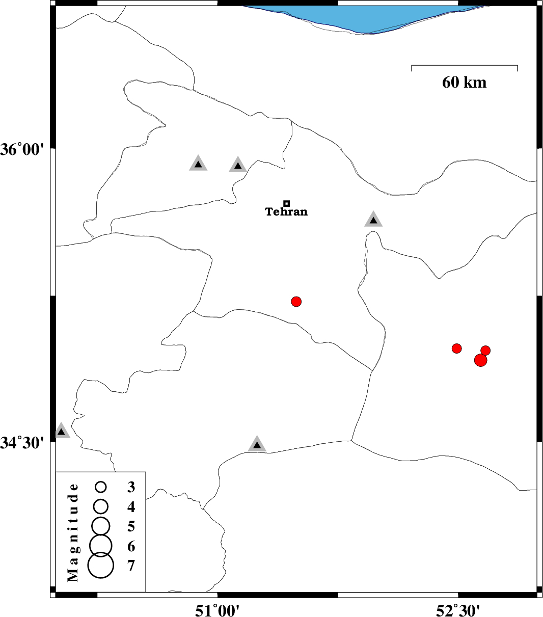 2008/09/16 | 15:03:10.7 | 19:33:10.7 | 34.98 | 52.49 | 14 | ML:2.7 | 29 km South-East of Garmsar, Semnan Province | ||