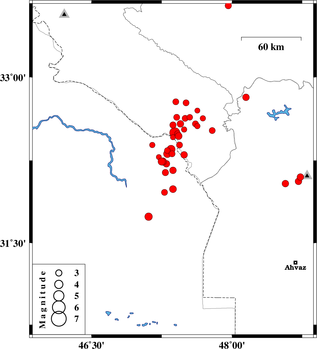 2008/09/02 | 22:32:17.7 | 03:02:17.7 | 31.99 | 47.37 | 36 | ML:3.4 | 78 km South-East of Dehloran, Ilam Province | ||