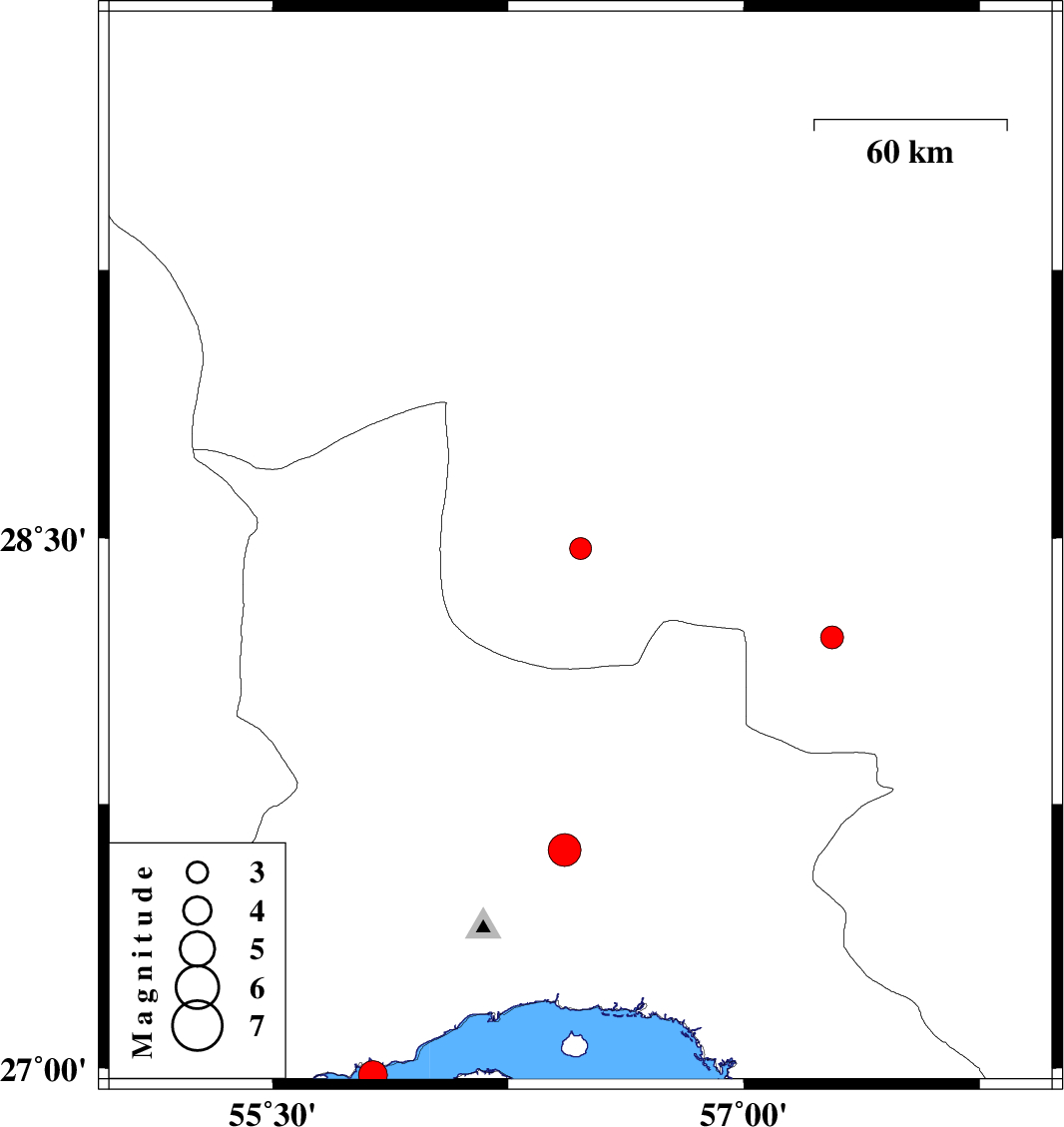 | 2008/09/26 | 03:36:32.3 | 07:06:32.3 | 26.98 | 55.82 | 6 | ML:4.1 | Persian Gulf, 44 km West of Qeshm |