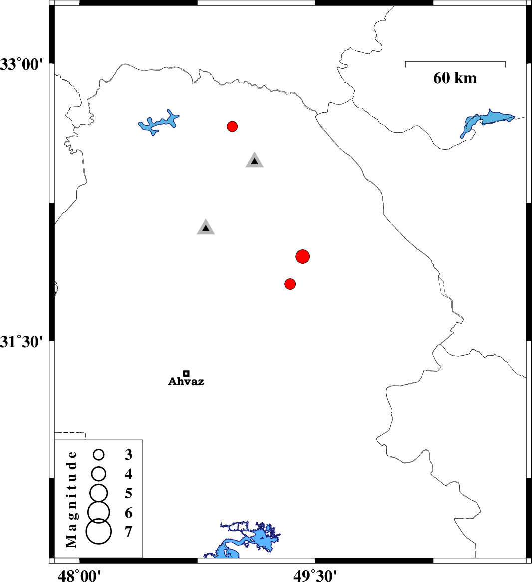 | 2008/10/03 | 03:19:07.8 | 06:49:07.8 | 31.81 | 49.34 | 15 | ML:3.1 | 14 km South of Masjed Soleyman, Khoozestan Province | ||