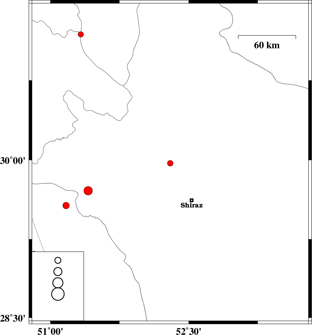 2008/09/22 | 11:34:07.5 | 15:04:07.5 | 29.57 | 51.17 | 38 | ML:3.3 | 34 km North of Borazjan, Bushehr Province | ||