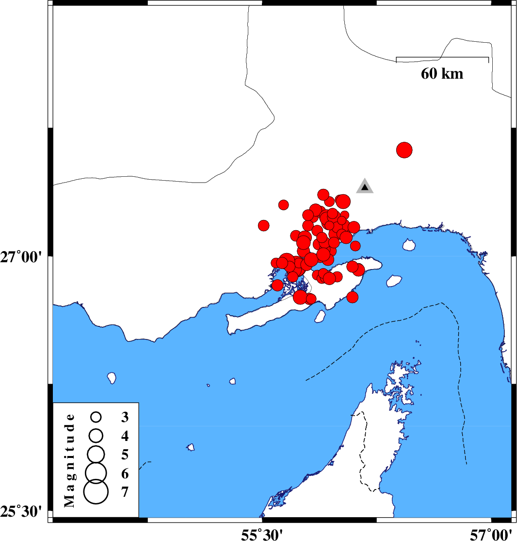 2008/09/10 15:57:57.6 20:27:57.6 26.7555.8110 ML:3.4 Persian Gulf, 50 km South-West of Qeshm
