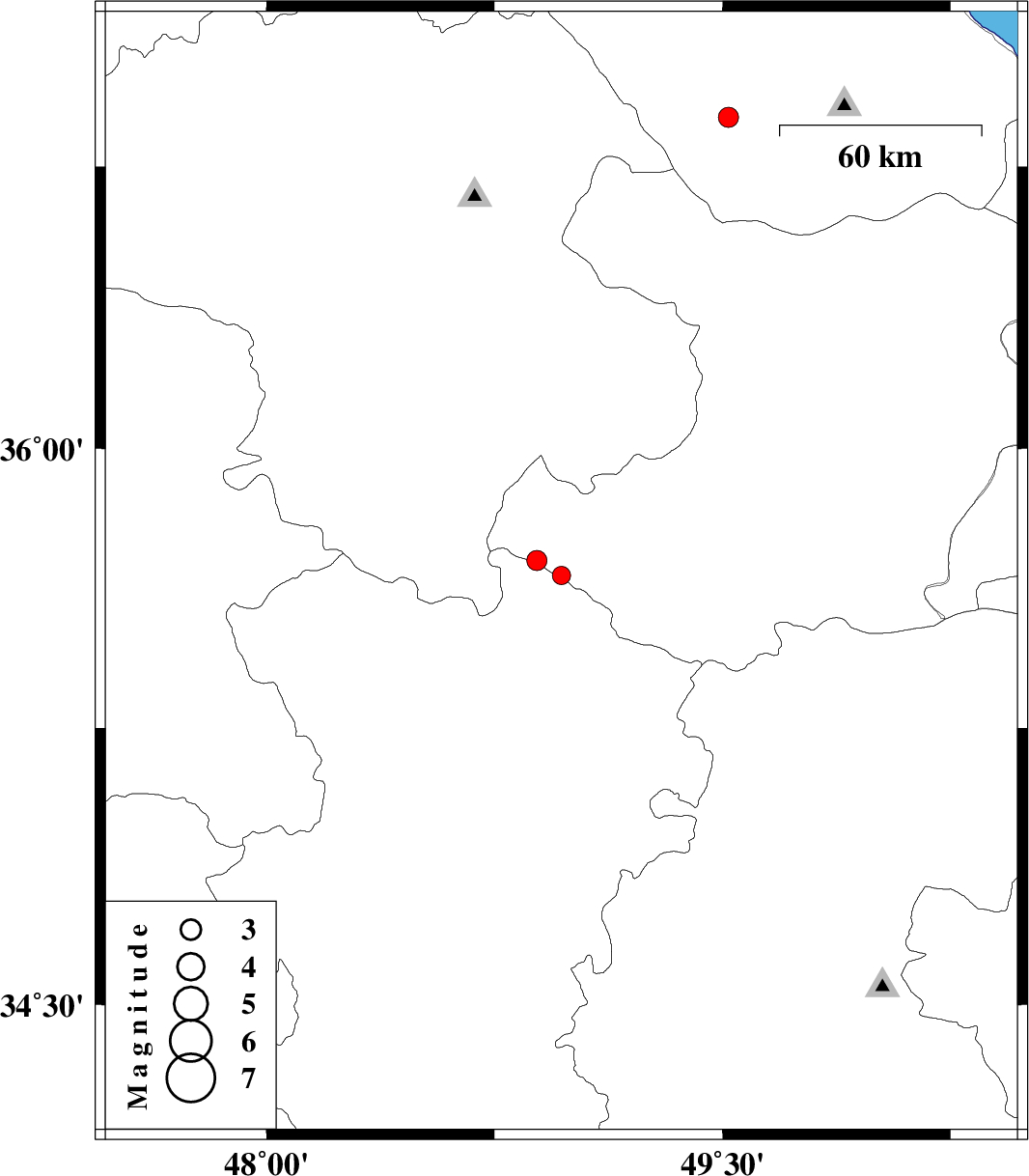 | 2008/10/05 | 22:18:32.3 | 01:48:32.3 | 35.66 | 48.97 | 15 | ML:2.7 | 31 km North of Razan, Hamedan Province | ||
