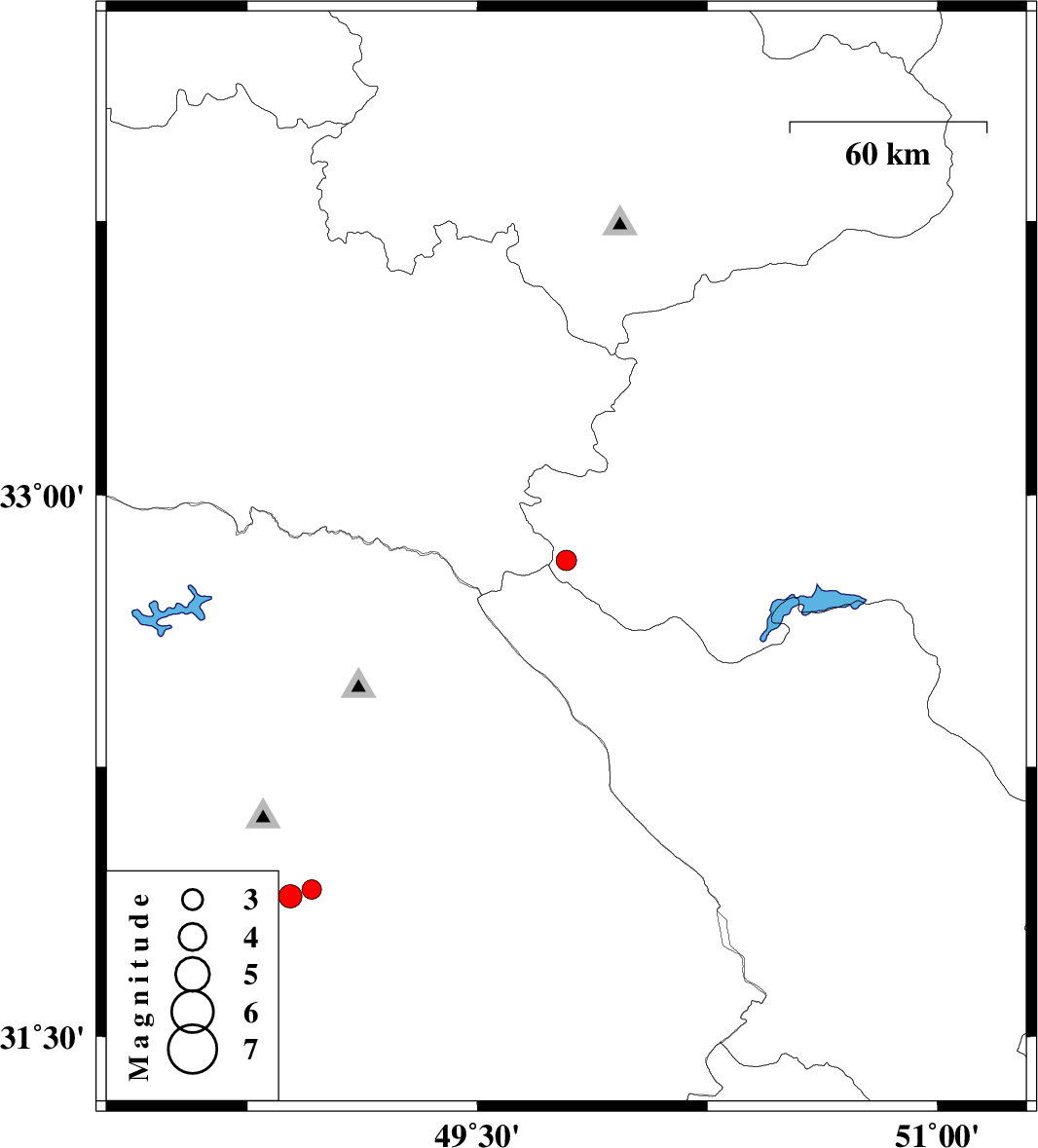 | 2008/10/12 | 18:11:38.0 | 21:41:38.0 | 32.82 | 49.79 | 15 | ML:2.9 | 33 km South-West of Fereydunshahr, Esfahan Province |
