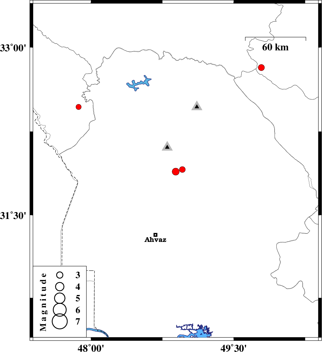 | 2008/10/12 | 23:11:16.9 | 02:41:16.9 | 31.89 | 48.89 | 10 | ML:3.4 | 17 km South of Shushtar, Khoozestan Province | ||