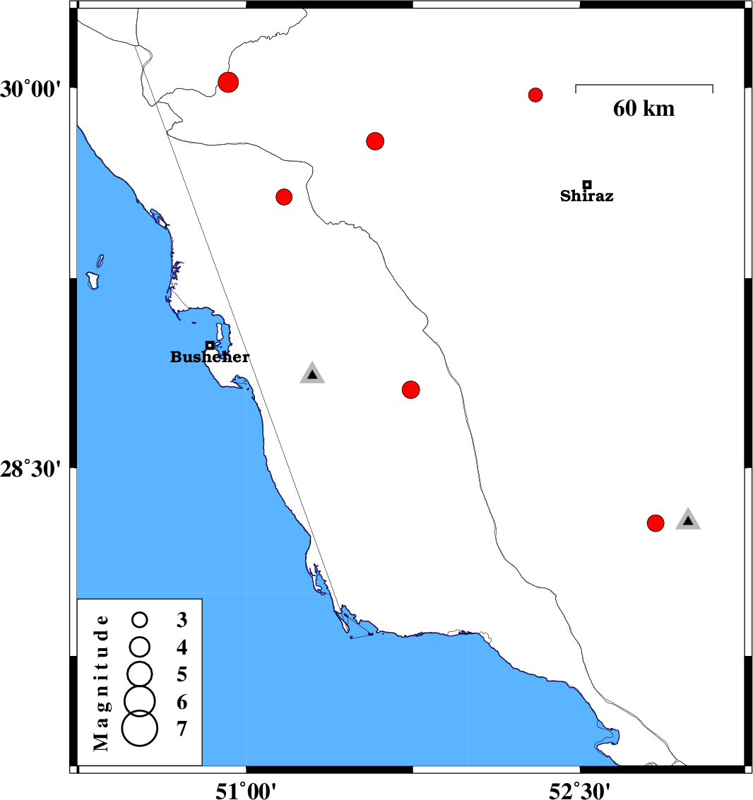 | 2008/09/22 | 11:34:07.5 | 15:04:07.5 | 29.57 | 51.17 | 38 | ML:3.3 | 34 km North of Borazjan, Bushehr Province |