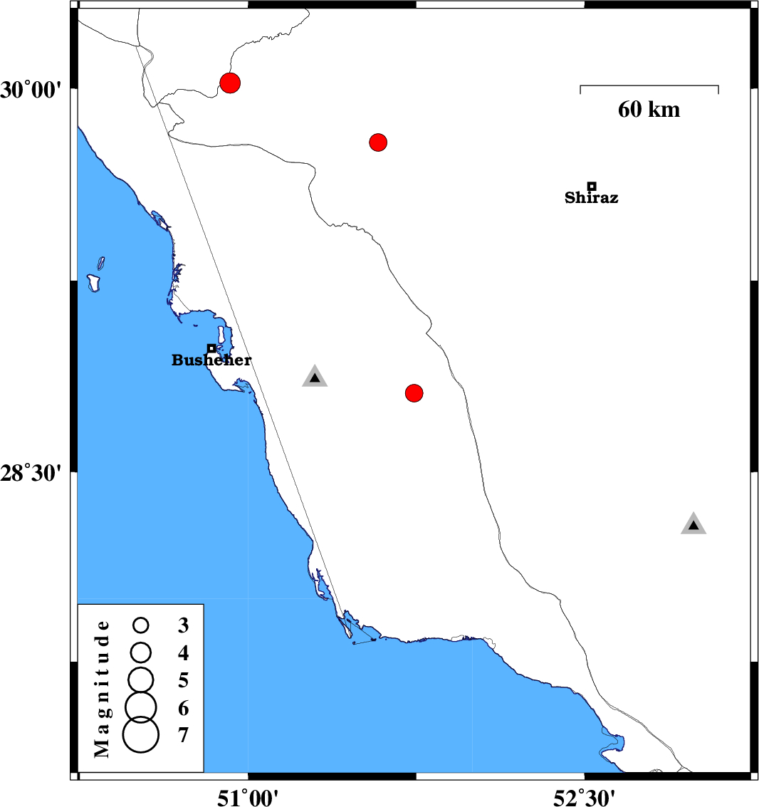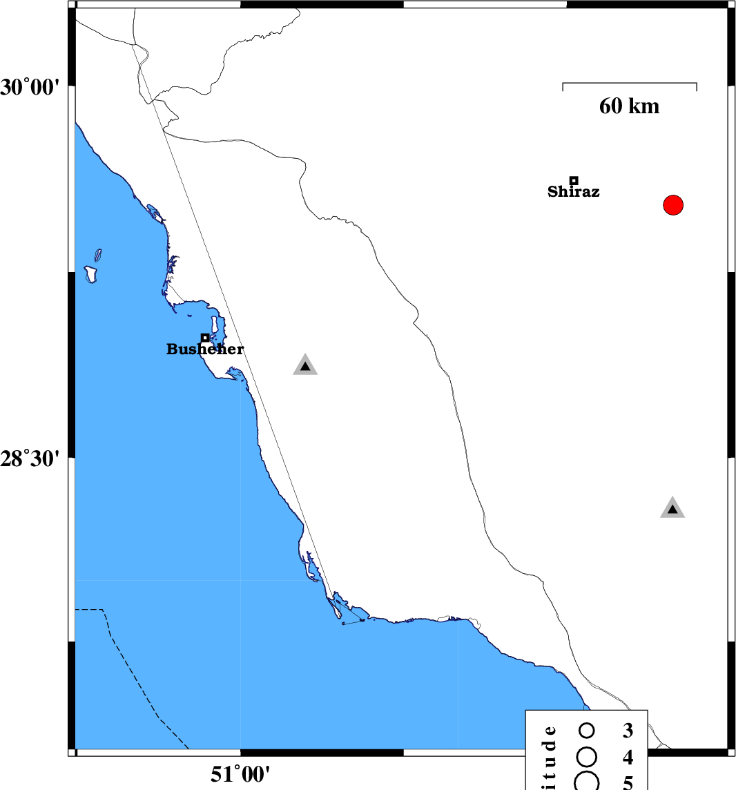 | 2008/10/16 | 00:16:35.8 | 03:46:35.8 | 29.79 | 51.58 | 45 | ML:3.5 | 20 km North of Kazerun, Fars Province |