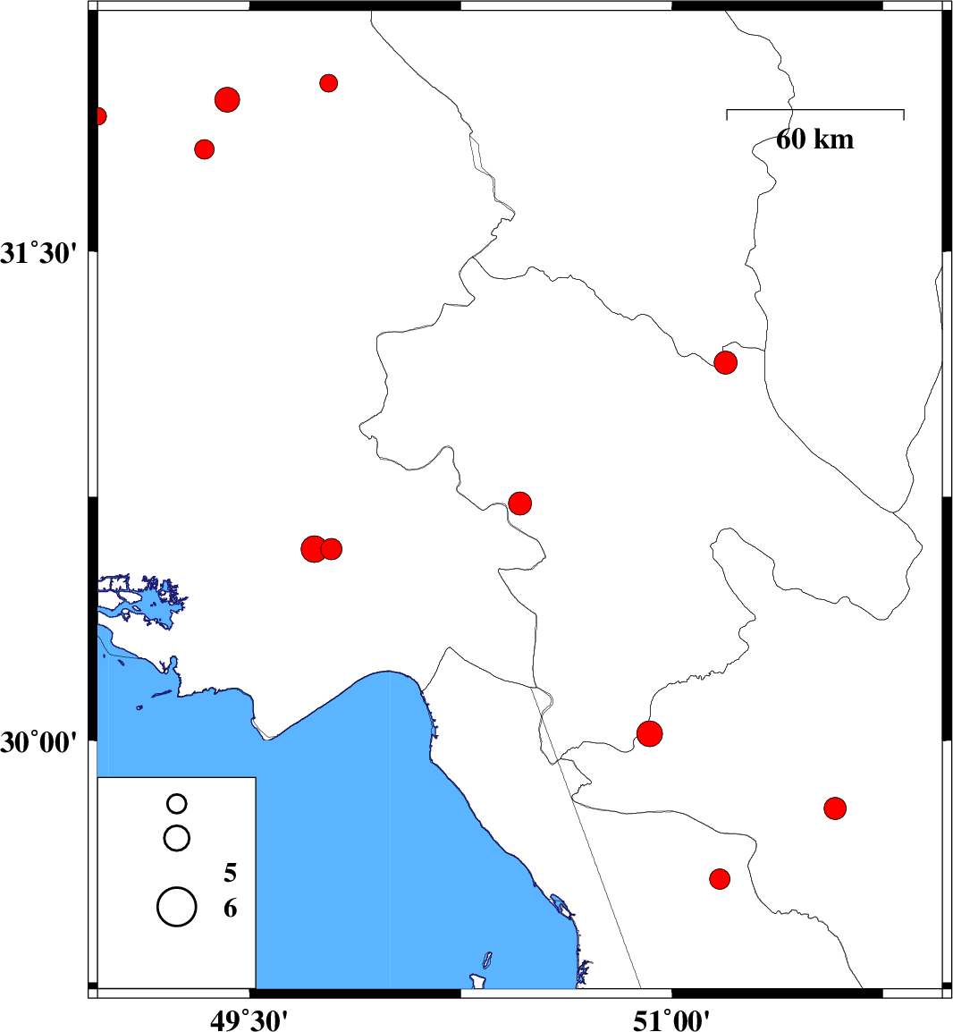 2008/09/25 | 15:32:08.1 | 19:02:08.1 | 30.59 | 49.73 | 15 | ML:4.3 | 19 km South of Omidiyeh, Khoozestan Province | ||