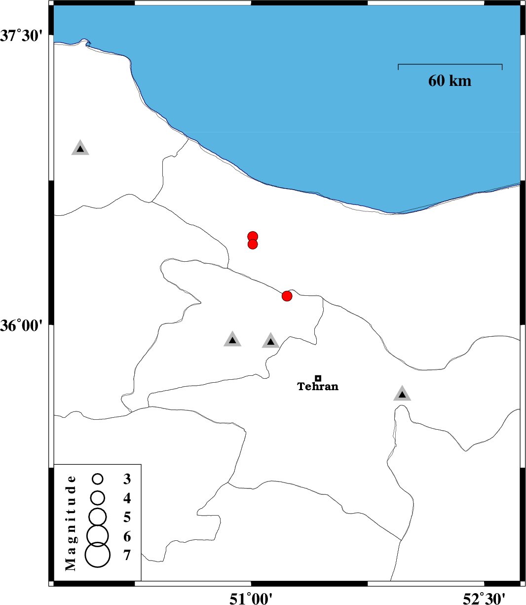| 2008/10/17 | 21:01:21.9 | 00:31:21.9 | 36.46 | 51.01 | 18 | ML:2.9 | 40 km South-East of Tonekabon, Mazandaran Province |