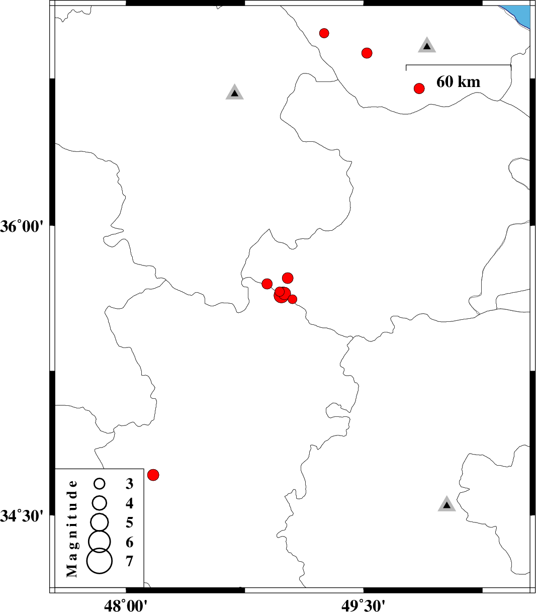 2008/10/19 | 08:24:21.5 | 11:54:21.5 | 34.71 | 48.17 | 14 | ML:3.2 | 9 km Asad Abad, Hamedan Province | ||